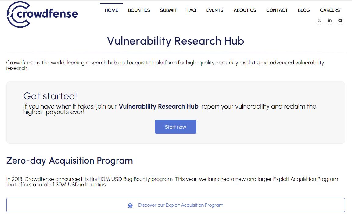 Crowdfense: Specialized in acquiring high-value vulnerabilities, primarily focusing on cybersecurity, offering substantial rewards for exploits that can compromise critical systems (https://www.crowdfense.com/).