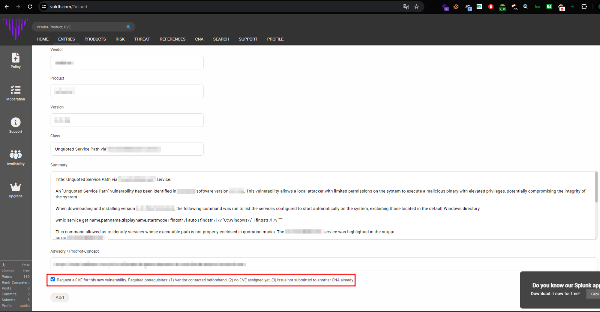 After filling in all the required fields and submitting the detailed description of the vulnerability, remember to check the box that says “Request a CVE”. The VulDB team will review your submission and, within approximately two weeks, assign a CVE to you.