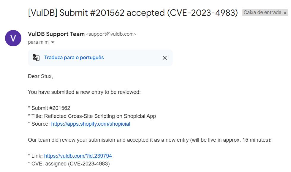 Here is an example of how you will receive the notification that your vulnerability is valid and that you have been assigned a CVE: